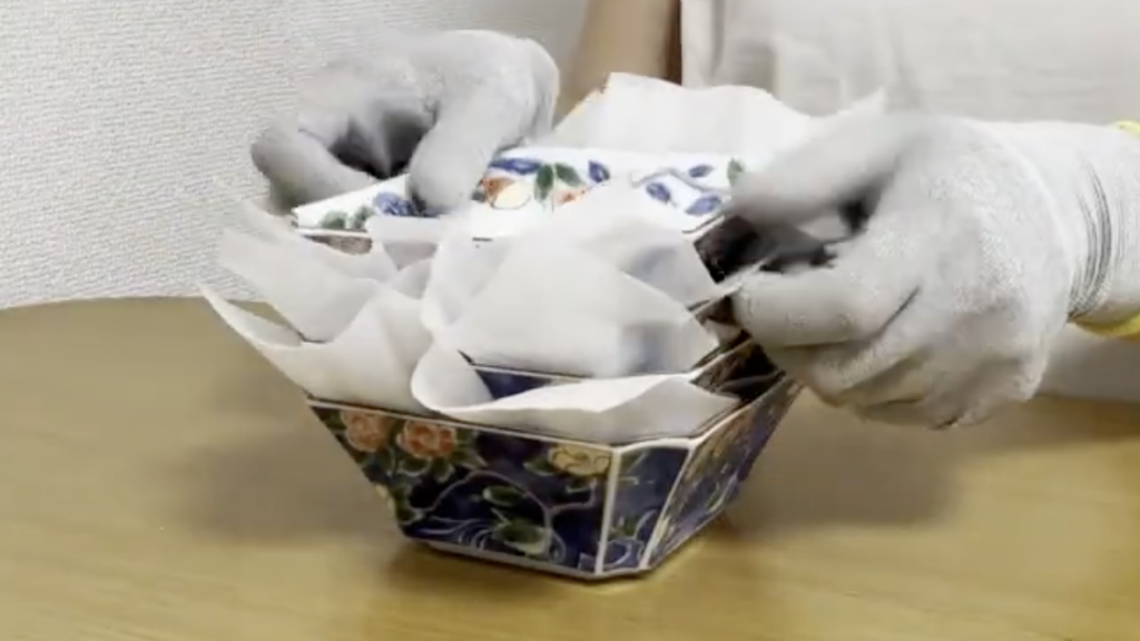 ✔ 食器同士が当たって割れないように、緩衝材を使って 食器が触れないようにする